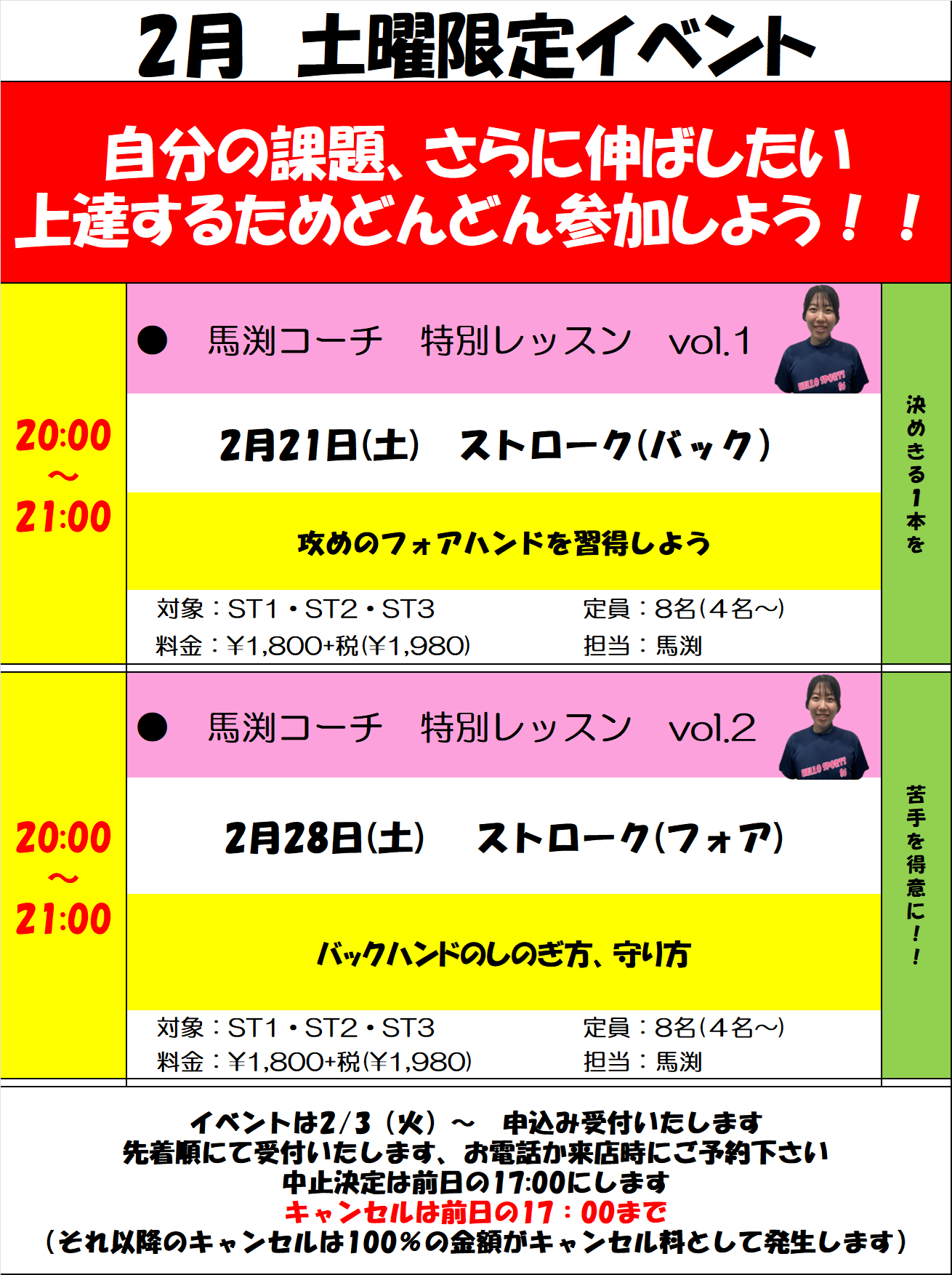 > 2/21,28(土) 馬渕コーチイベント
