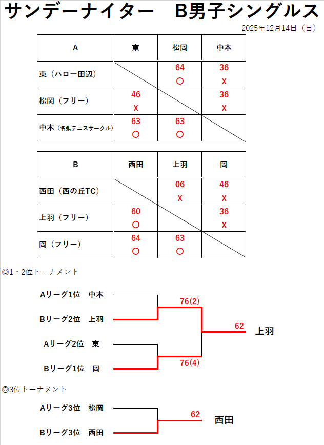 サンデーナイターB男子シングルス入賞者 2024.12.1