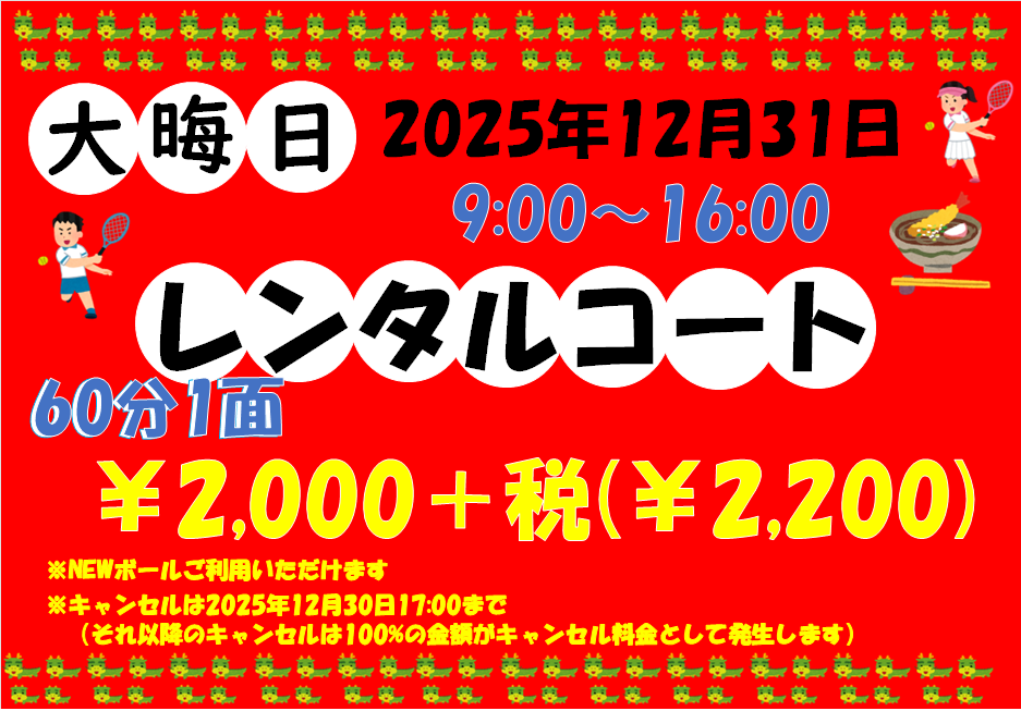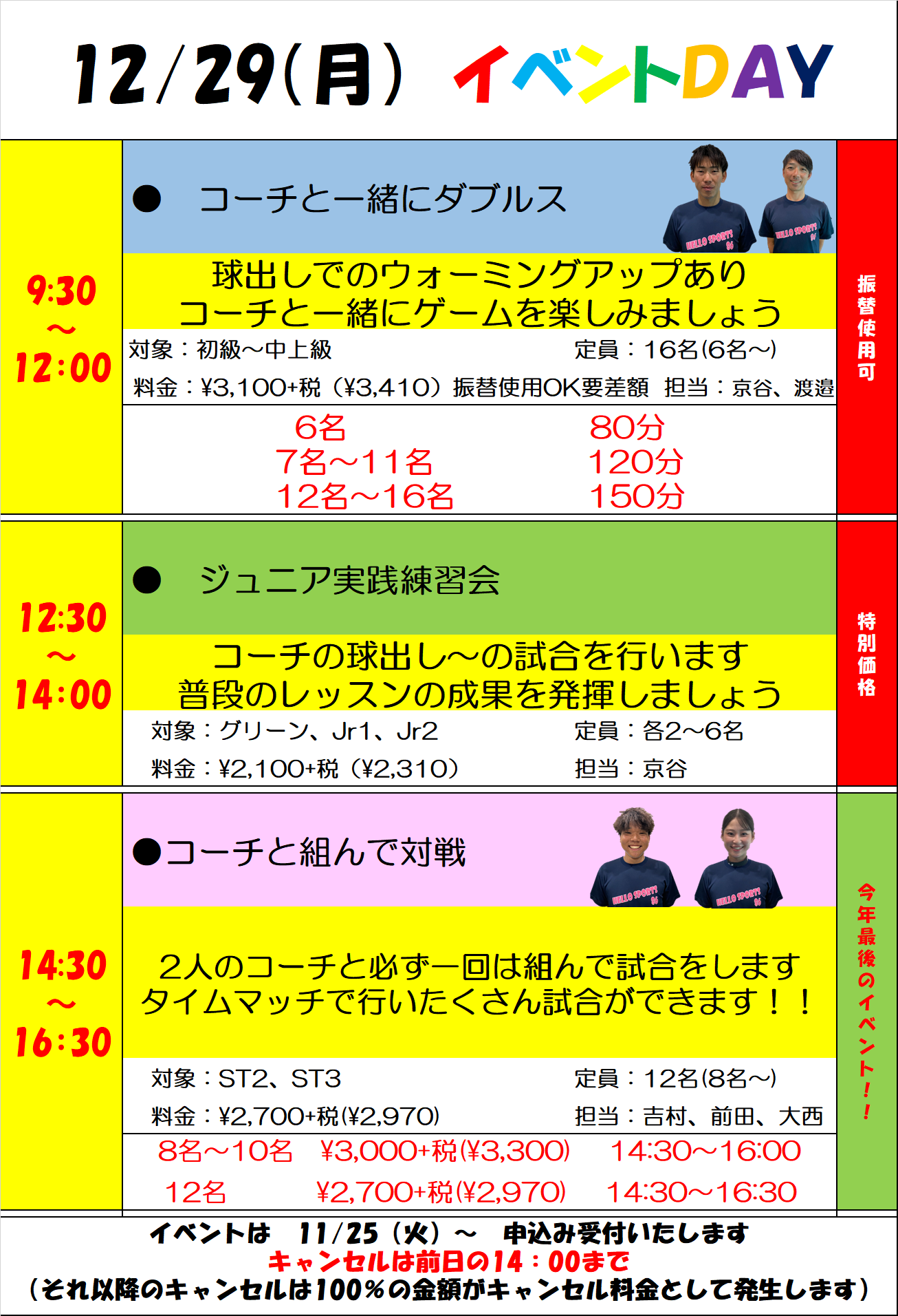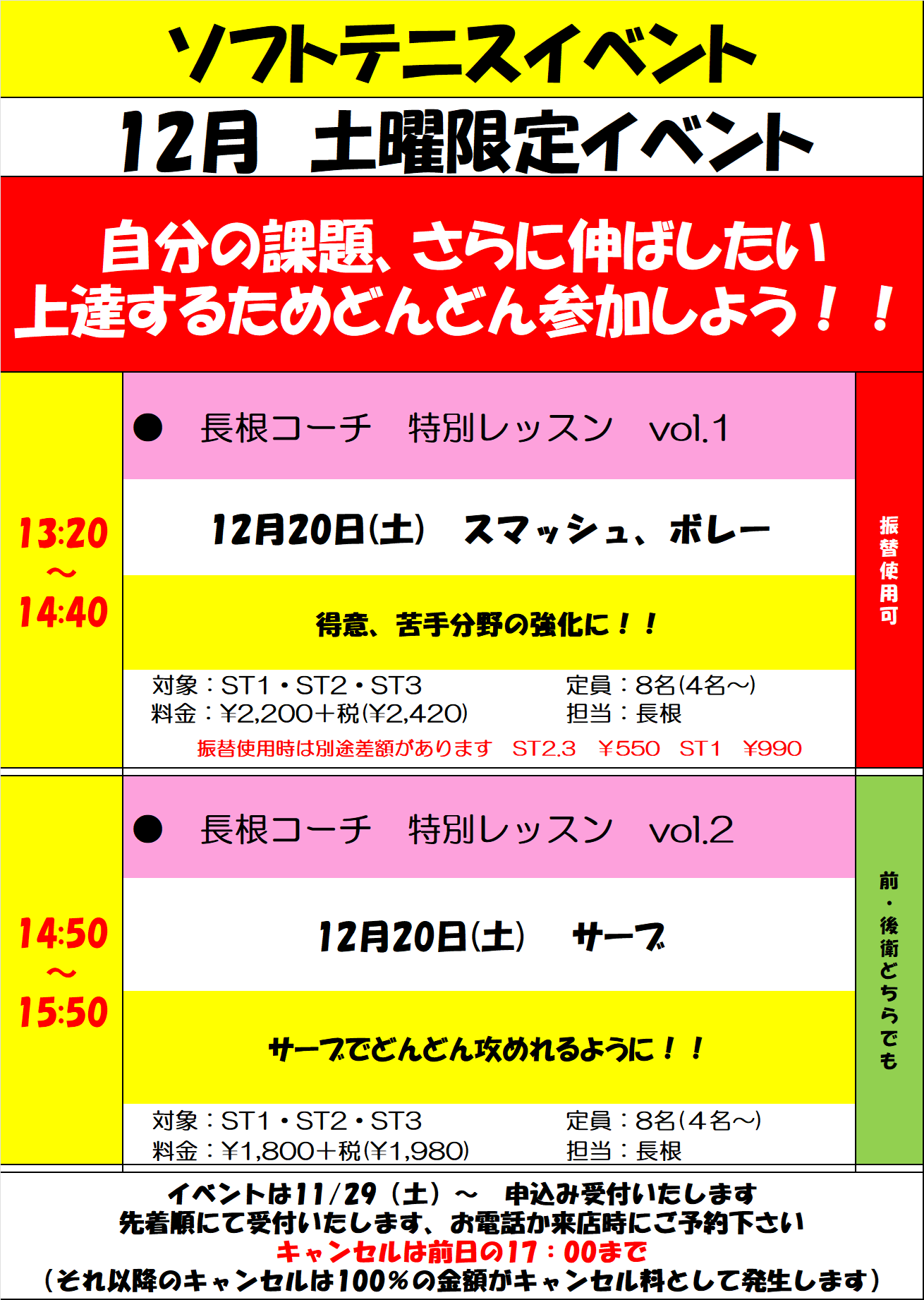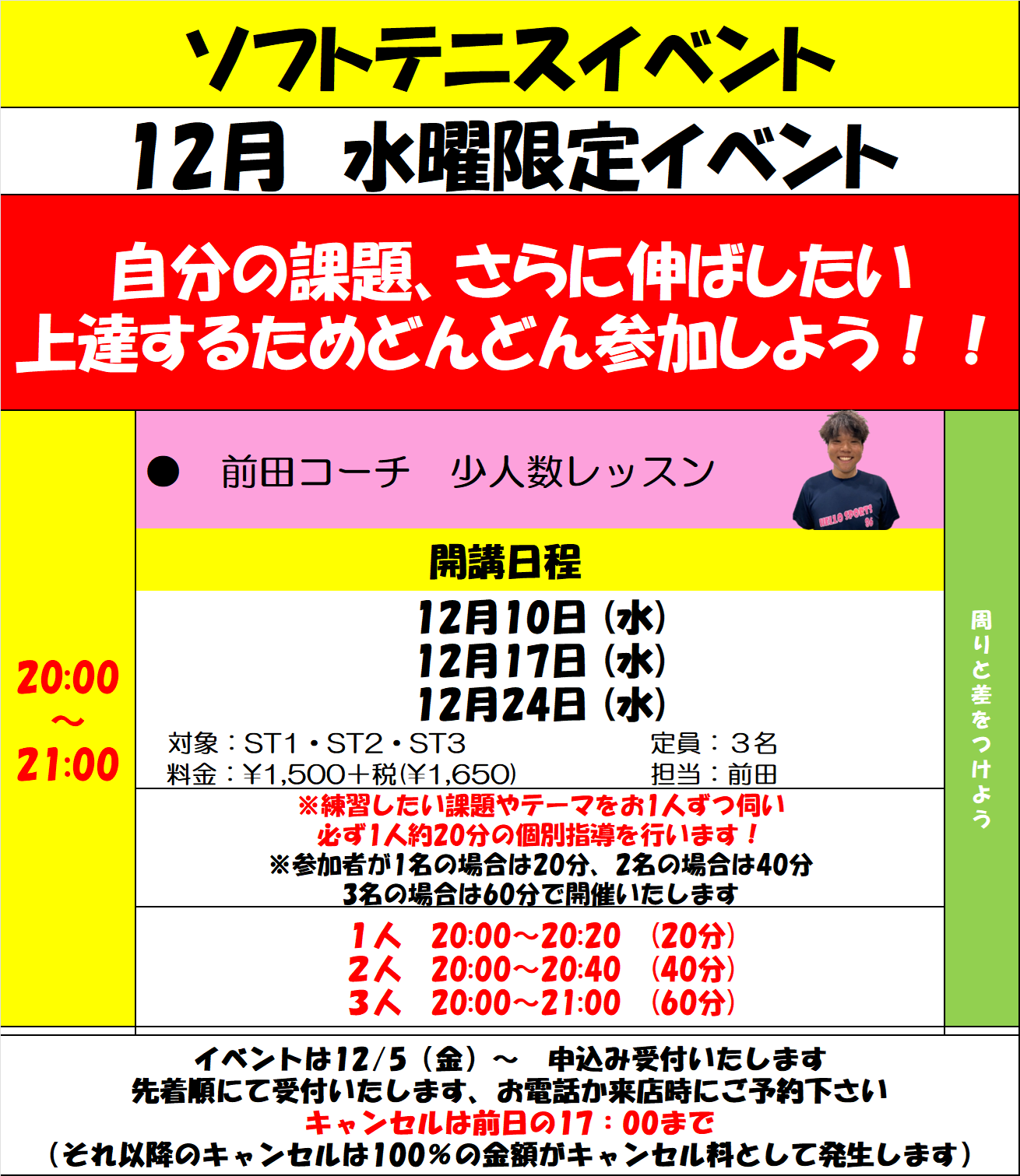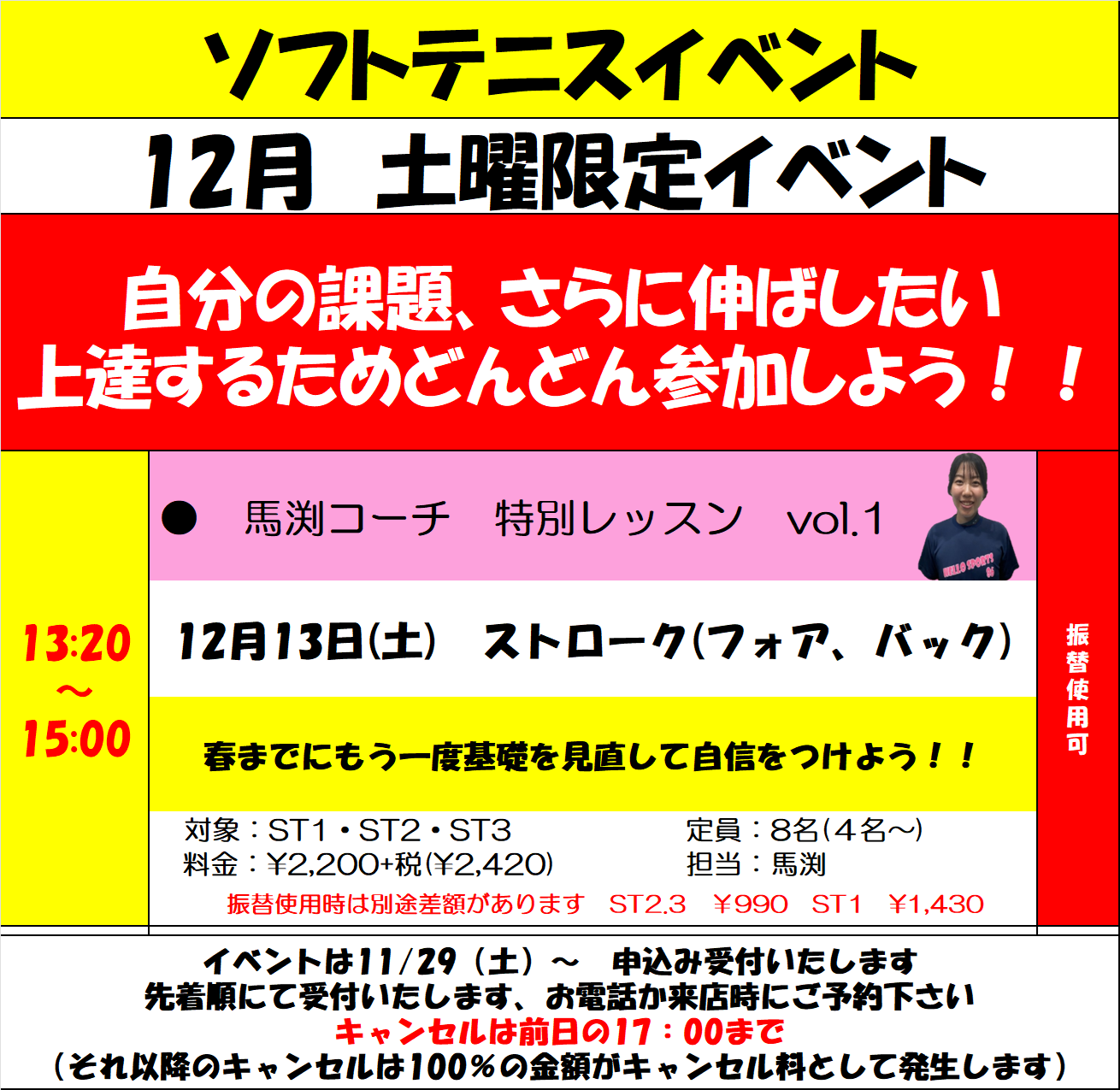 2025年12月05日12月 ソフトテニス 水曜日限定イベント 2025年11月29日12/20(土) ソフトテニスイベント 2025年11月29日12/13(土) ソフトテニスイベント 2025年11月25日12/29(月) イベント情報 2025年11月20日1/2.3 レンタルコート 2025年11月20日12/31 レンタルコート 2025年11月10日年末イベント 2025年11月04日11.30(日) ハロースポーツ ソフトテニスカップ 2025年11月02日Jr3.Jr4 CUP 2025年10月24日11/23、11/24 ソフトイベント 123NEXT