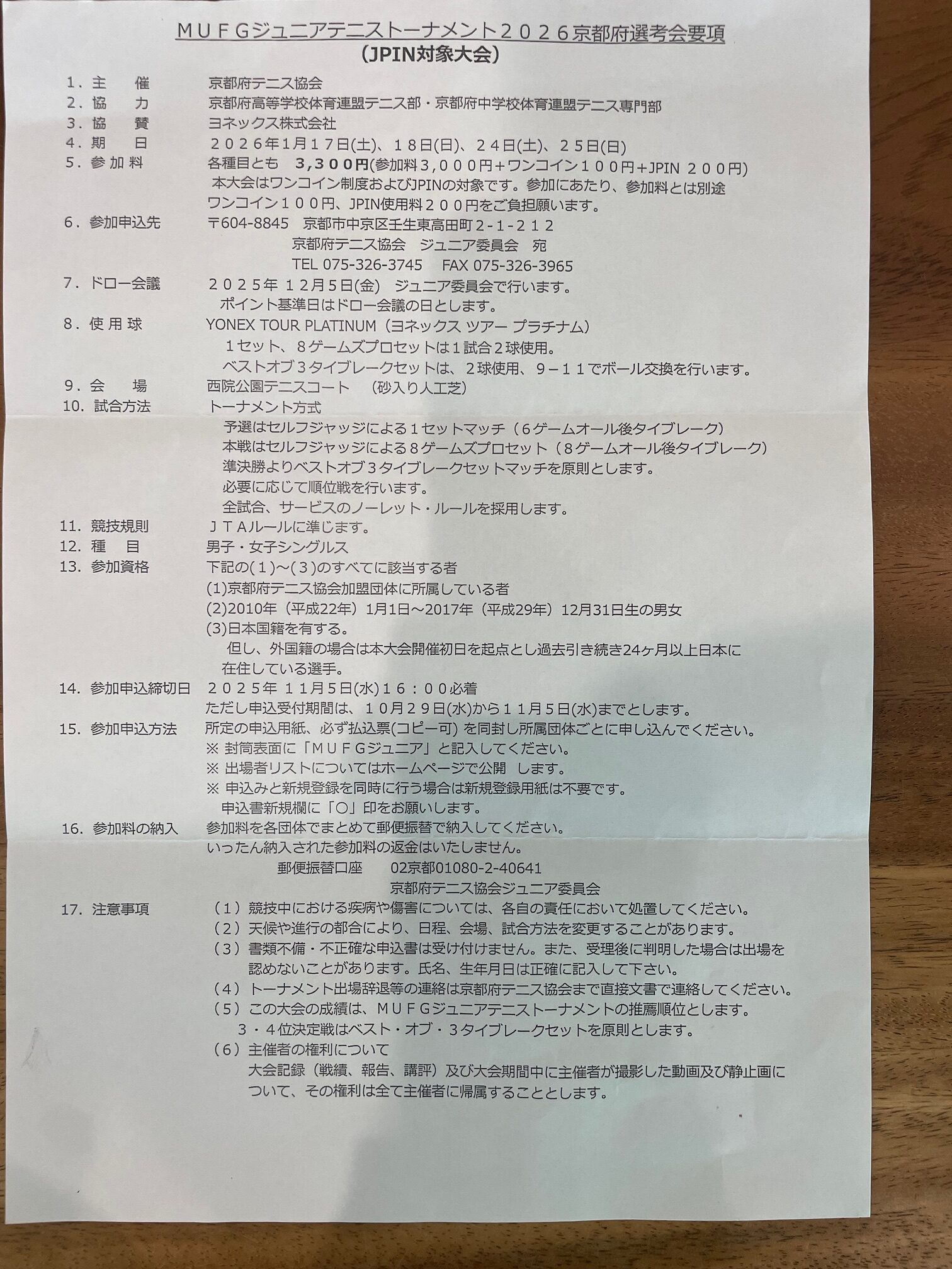 MUFGジュニアテニストーナメント2026京都府選考会要項です。