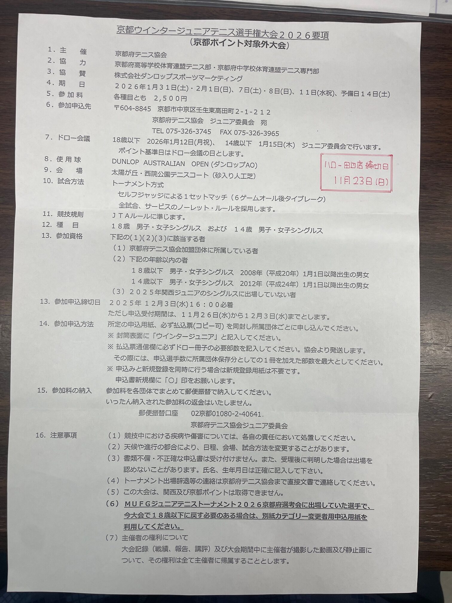 京都ウィンタージュニアテニス選手権大会要項の案内です。