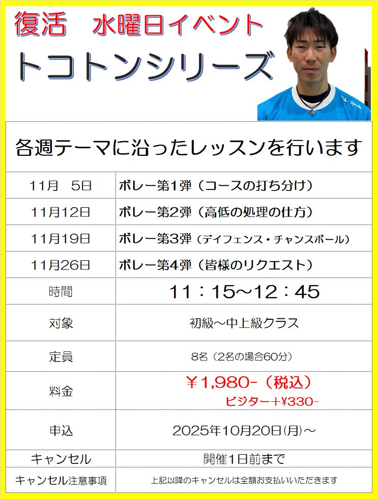 11月の水曜日から水曜日専科の渡邉コーチによる『トコトンシリーズ』が復活します。