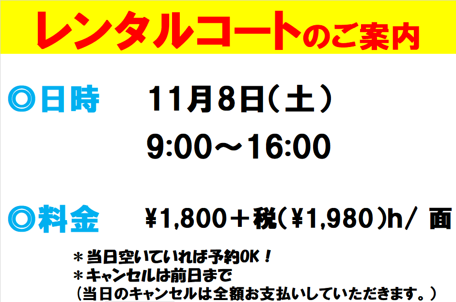 11月8日(土)の9:00~16:00の間、レンタルコートが出来ます。